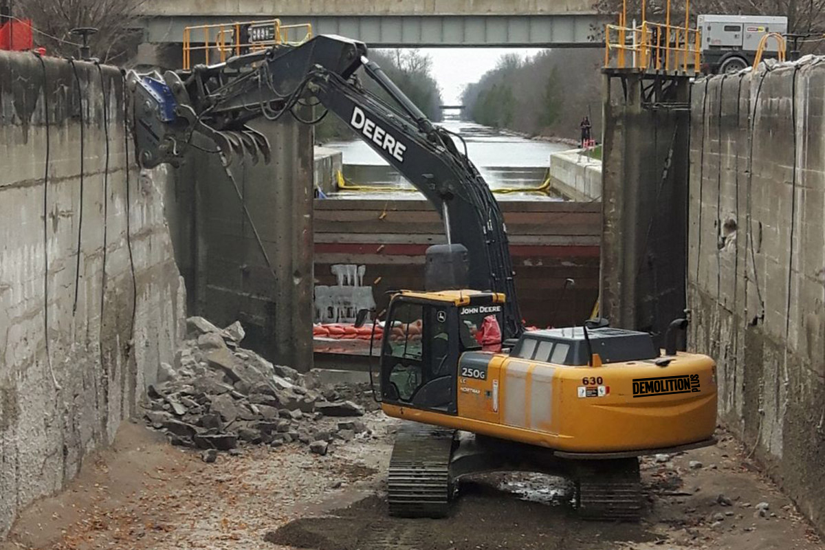 Concrete Wall Removals of Trent Severn Locks 39-41. Concrete face demolition and disposal of approximately 1,600 Cu Meter from lock 39, 40, & 41. Furthermore, the work involved the removal and disposal of all steel pipe handrails, aluminium handrails and mooring cables